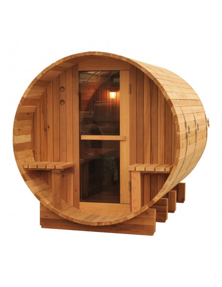 Les extrémités avant et arrière sont entièrement préassemblées et la porte est pré-accrochée à l'aide de charnières à fermeture automatique. Le sauna Barrel peut être assemblé en quelques heures seulement. Il est fabriqué à partir de cèdre rouge de l'Ouest. Ce qui distingue un sauna en cèdre, c'est l'ambiance et l'odeur du cèdre rouge qui ne peut provenir que d'un sauna en bois naturel.