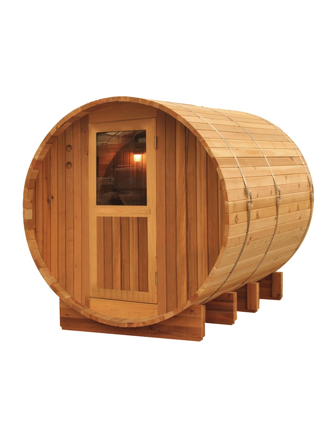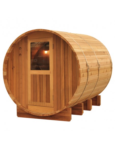 Les extrémités avant et arrière sont entièrement préassemblées et la porte est pré-accrochée à l'aide de charnières à fermeture automatique. Le sauna Barrel peut être assemblé en quelques heures seulement. Il est fabriqué à partir de cèdre rouge de l'Ouest. Ce qui distingue un sauna en cèdre, c'est l'ambiance et l'odeur du cèdre rouge qui ne peut provenir que d'un sauna en bois naturel.